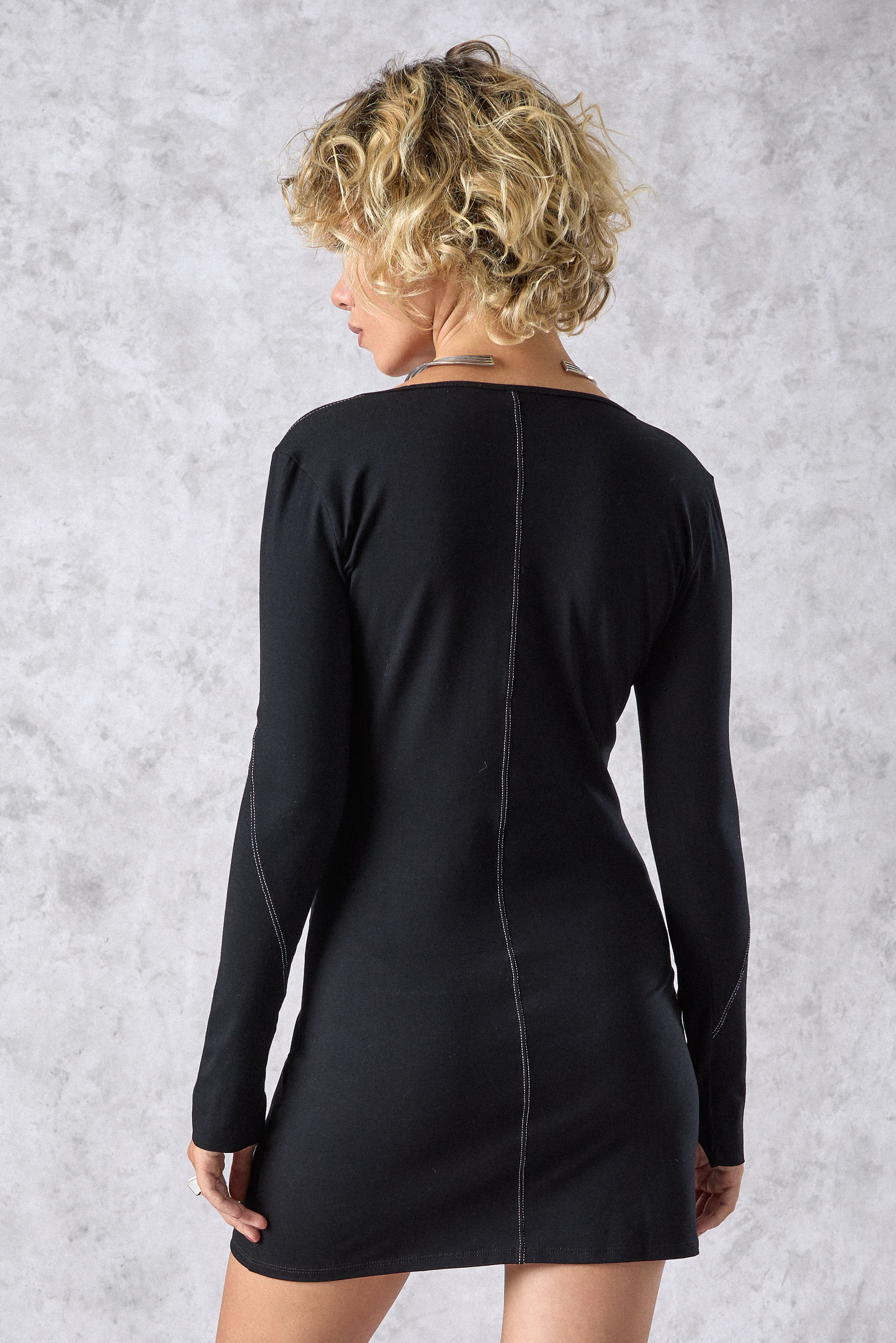 - Made to move with you in style, this above-the-knee dress features intricate stitching along the arms, shoulders, and back, adding an edgy touch of sophistication.