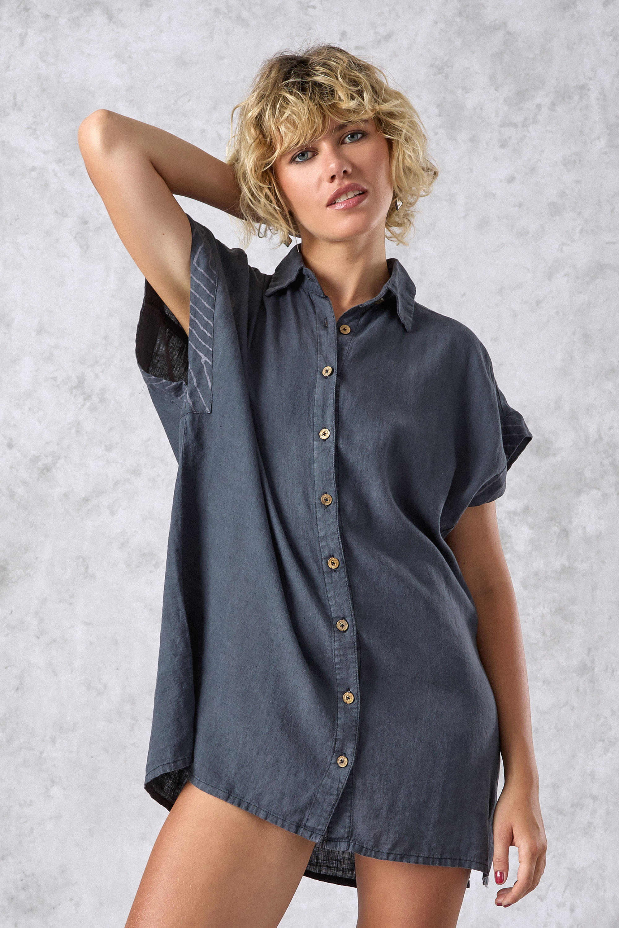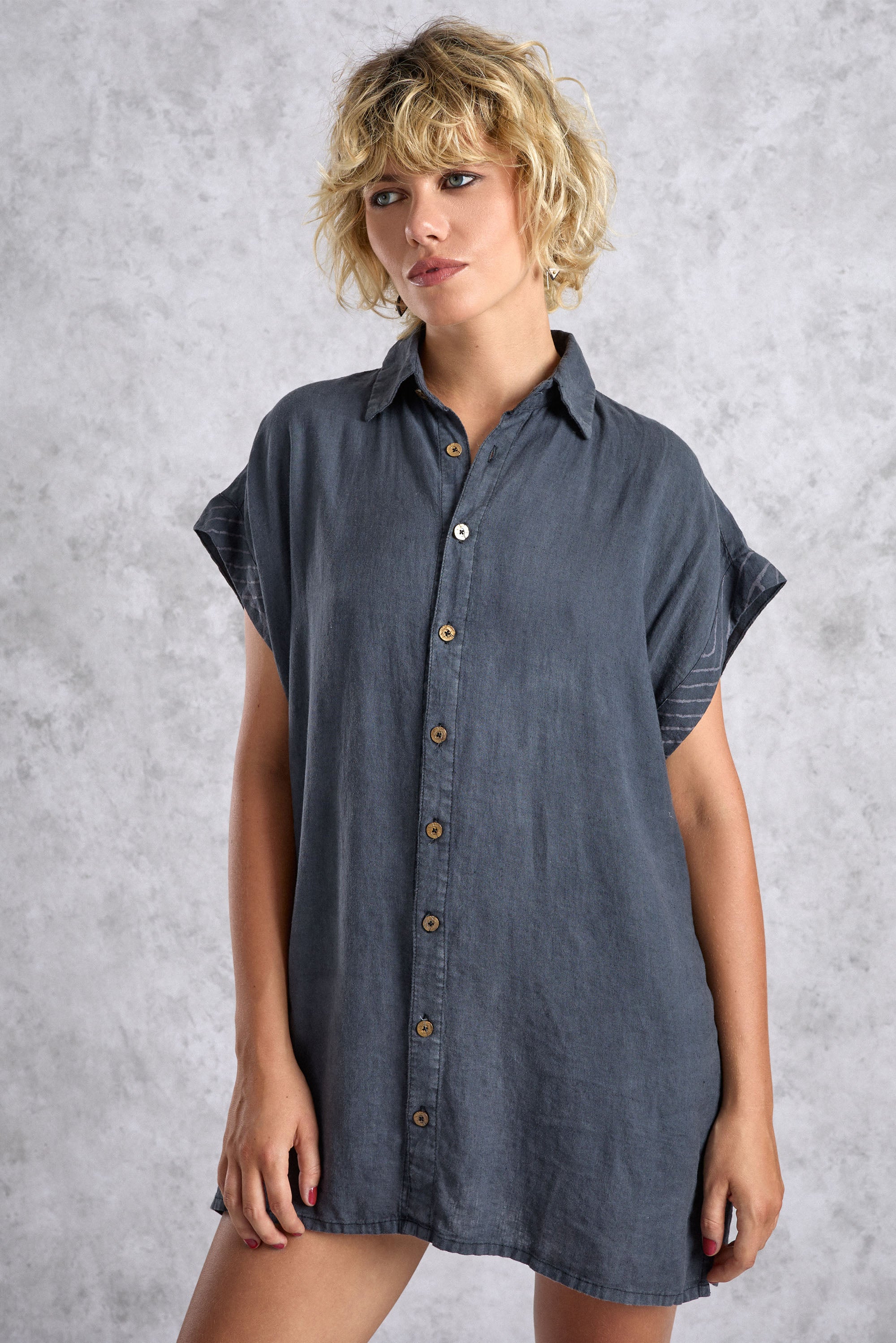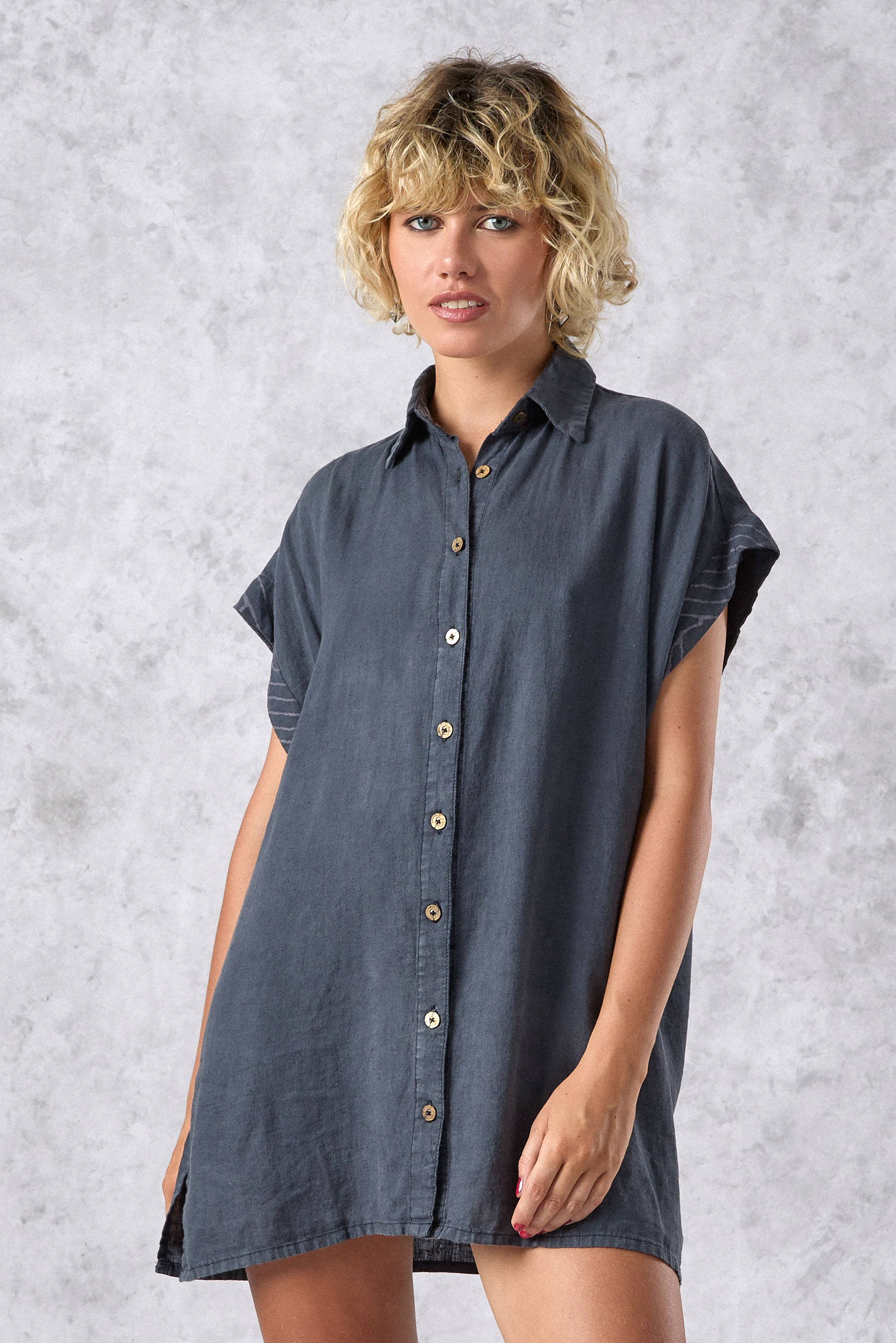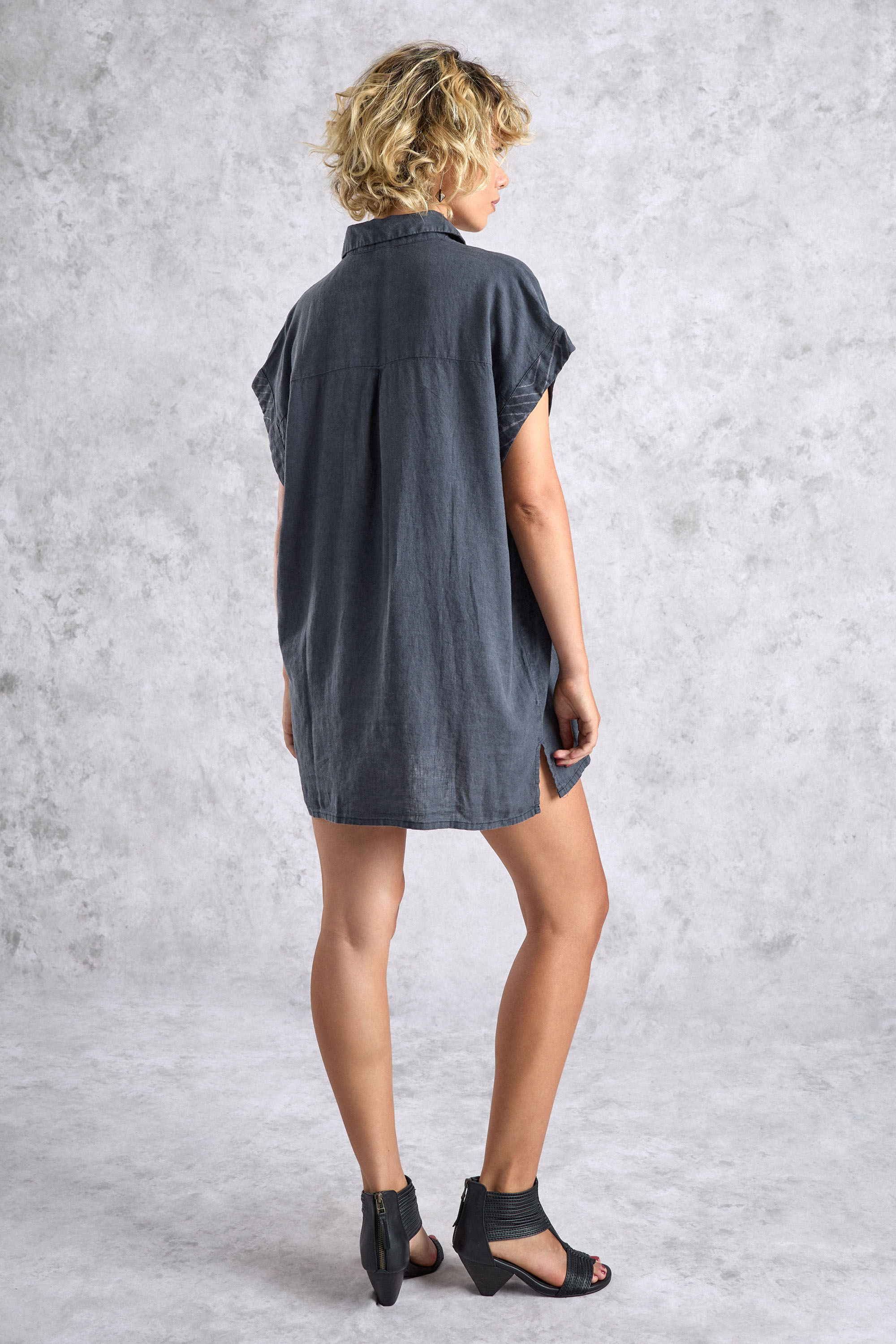 - It features a classic collar and button-down design, complemented by custom metal buttons and flattering short slits up both sides above the knee, striking a perfect balance between relaxed and refined.